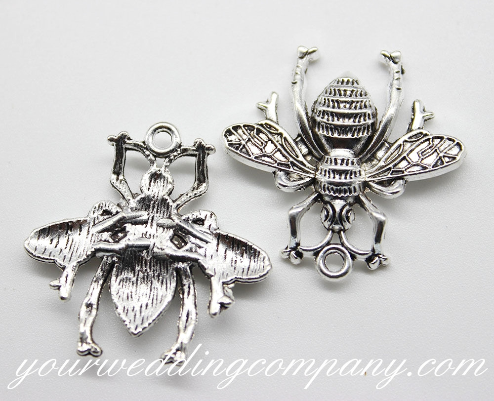 These antique silver finish bee charms make cute favor charms, invitation accents, bouquet charms, necklace pendants, etc. Perfect for the "Meant to Bee" wedding theme. Each detailed charm is 27mm x 27mm with a loop at the top. Pack of 12.
