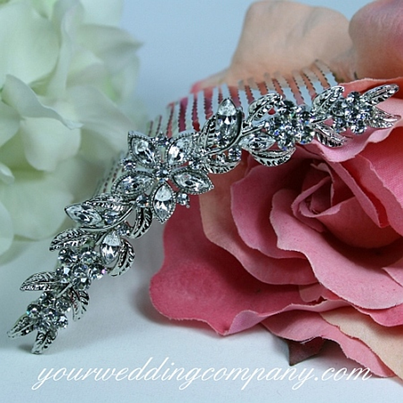 This petite, Swarovski crystal hair comb adds a sparkling touch to your hair and would be perfect for a garden-themed or outdoor wedding. The comb measures 3/4 inch high and approximately 4 inches long. The flower crystals are clear and the leaves are a combination of crystal marquise stones and formed, silver leaves. The finish is silver rhodium.