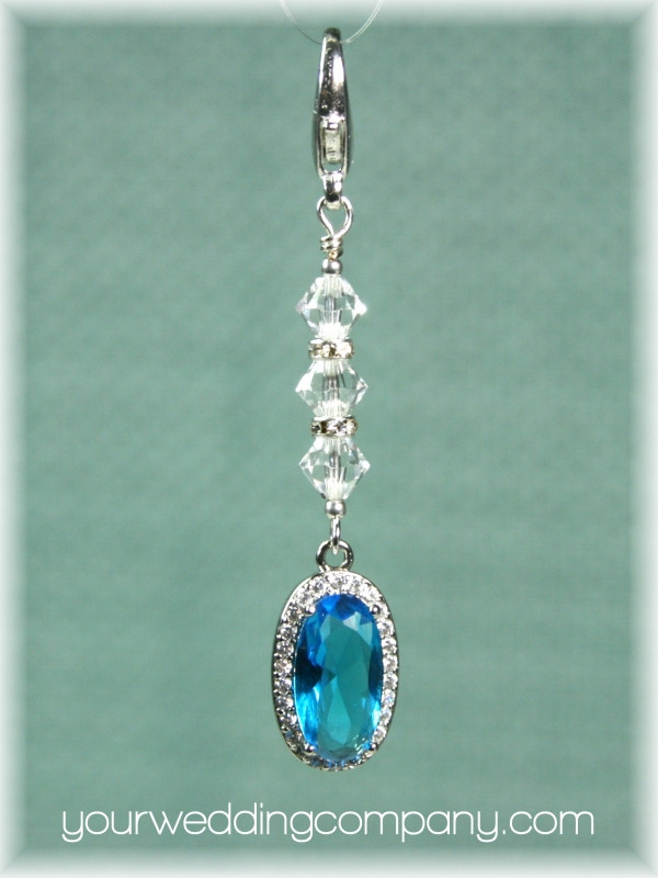 This handmade keepsake charm is made with a gorgeous 18mm oval pendant in an aqua blue cubic zirconia surrounded with clear CZ stones. It also has a silver-plated lobster clasp and three sparkling Austrian bicone crystal beads separated by a silver and crystal rondelle spacers.