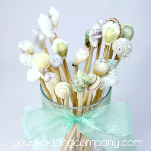 Accented with natural seashells, these 10-inch tall swizzle sticks will bring a touch of the sea to your event. Great for luaus or tropical-themed weddings and parties where tall drinks are served. Pack of 20 swizzle sticks. The glass cup and ribbon are not included.