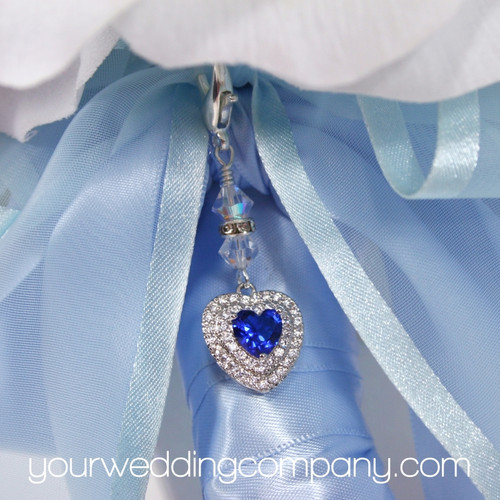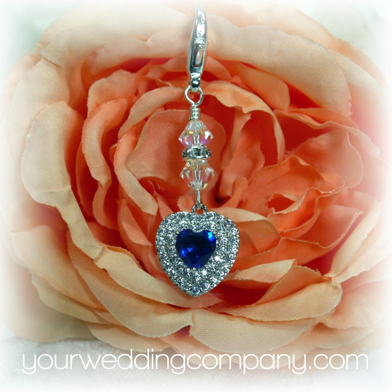 This small handmade keepsake charm is made with a gorgeous Austrian crystal 14mm heart pendant in a deep sapphire blue cubic zirconia with surrounding clear CZ stones. It also has a silver-plated lobster clasp, and two sparkling bicone crystal beads separated by a silver and crystal rondelle spacer. It's very sparkly!