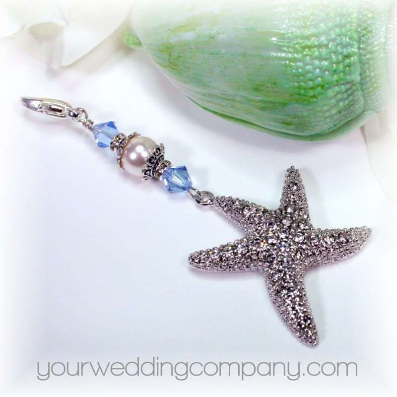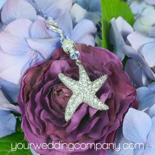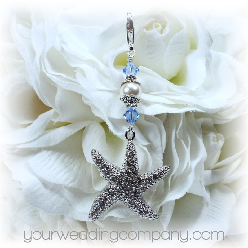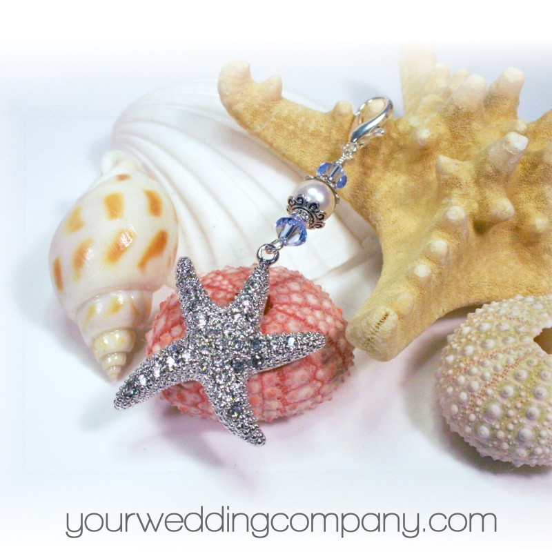 This handmade keepsake charm is made with a sparkling 1-1/8 inch starfish charm hand-set with 33 sparkling, hand-set clear rhinestones. It has a silver-plated lobster clasp, two pretty light blue Austrian crystal beads, mini rhinestone rondells and a white glass pearl accent bead.