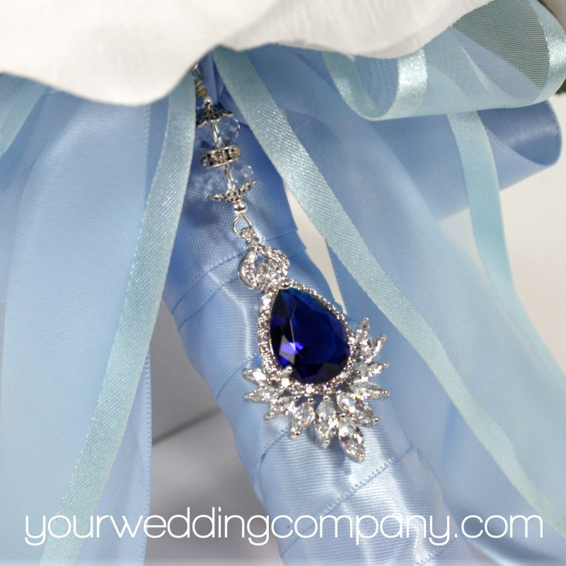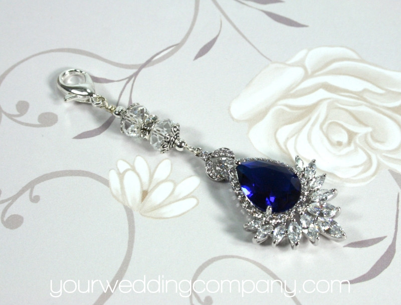 This handmade keepsake charm is made with a sparkling 1.5 inch sapphire blue teardrop charm with sparkling hand-set CZ stones. It has a silver-plated lobster clasp, a rhinestone rondell and two round Austrian crystal accent beads.