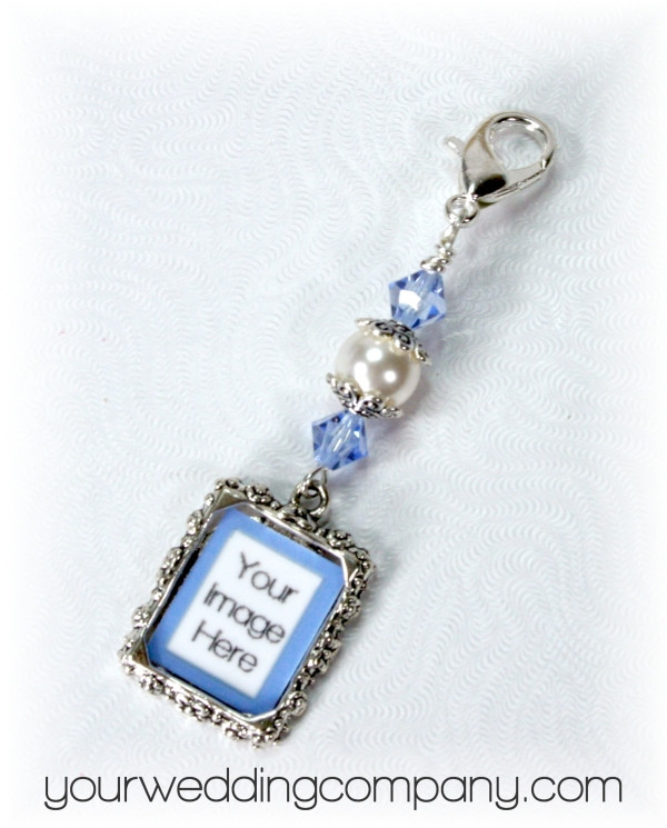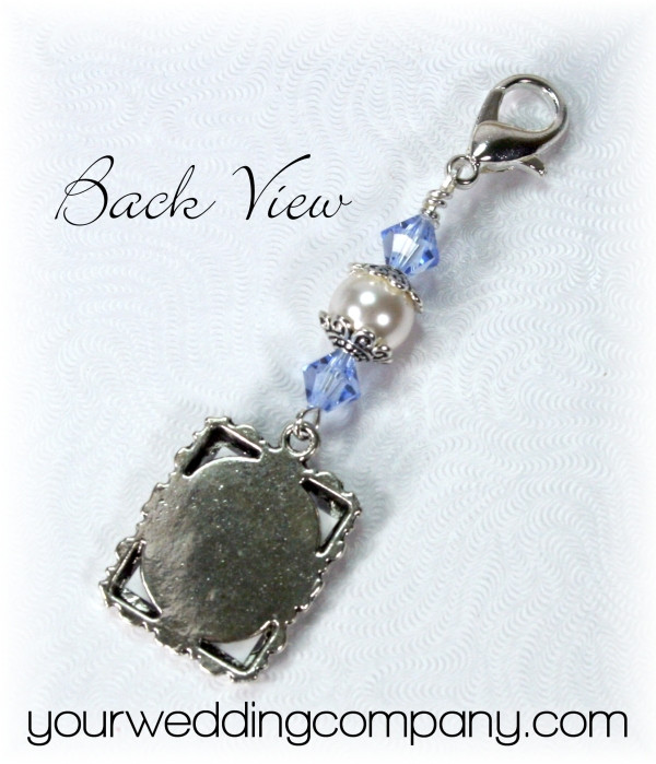 This handmade keepsake charm is made with a silver tone 5/8" wide x 1" high miniature frame/charm and holds a small photo 1/2" wide by 5/8" high. It has a silver-plated lobster clasp, two pretty blue bicone crystal beads, and a white crystal pearl focal bead. You can add any photo, saying or graphic you like that has special meaning to you. Many brides use these as memory charms for a loved one who has passed.