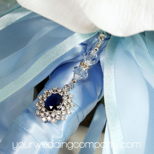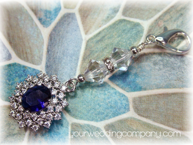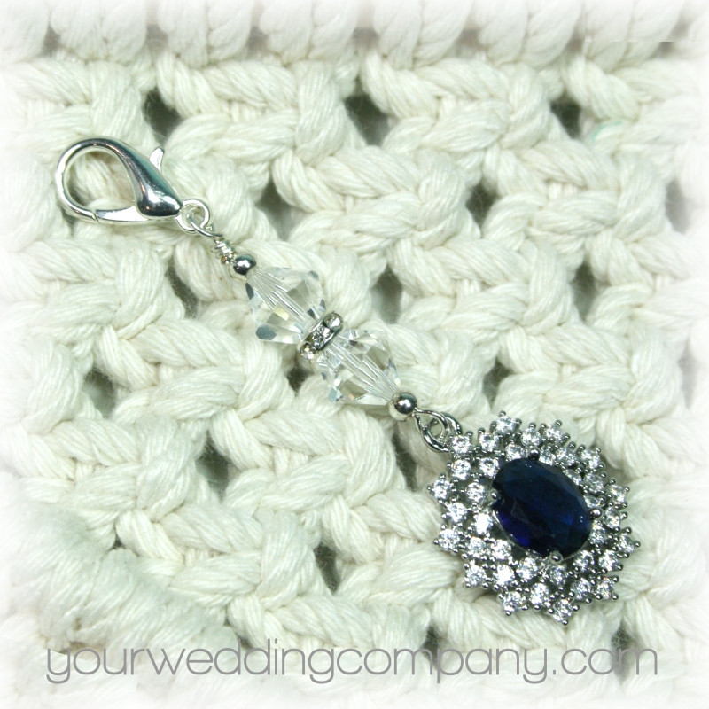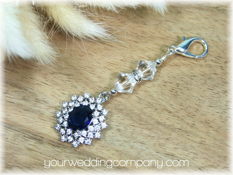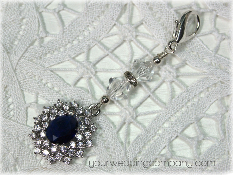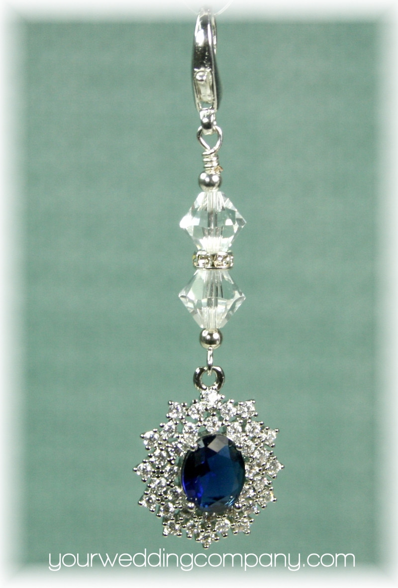 This handmade keepsake charm is made with a sparkling 20mm x 18mm pendant which includes a deep sapphire blue oval cubic zirconia stone surrounded with 36 clear handset CZ stones. It also includes a silver-plated lobster clasp and two sparkling Austrian bicone crystal beads separated by a silver and crystal rondelle spacer.