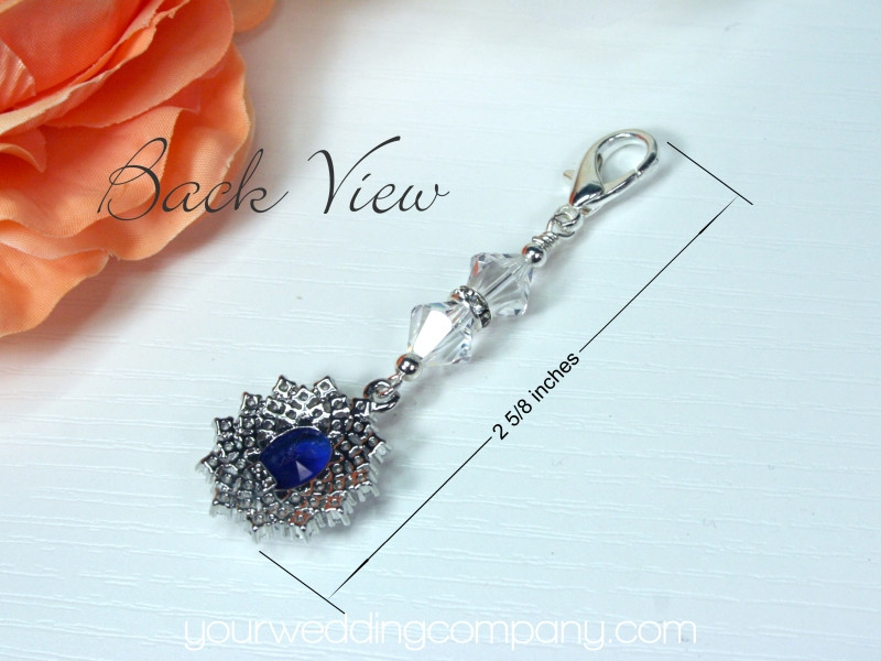 This charm measures a total of 2-5/8 inches long (including the clasp). Please see photos. You can easily attach it to your wedding bouquet, keepsake garter or inside your dress hem.