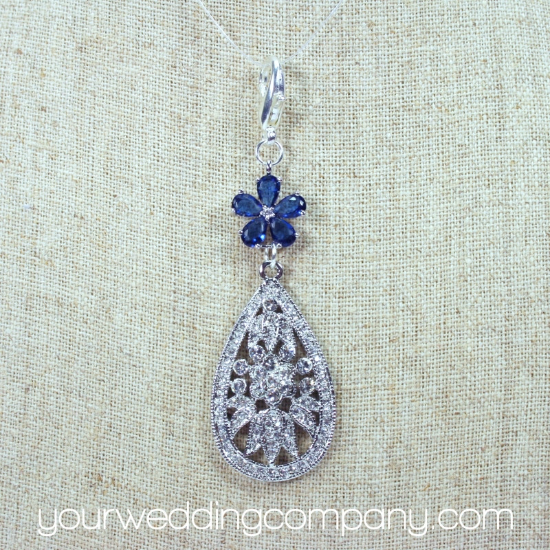 This handmade keepsake charm is made with a large 1-1/2 inch clear cubic zirconia (CZ) teardrop charm with a flower motif. It has a silver-plated lobster clasp and a pretty sapphire blue flower connector bead.