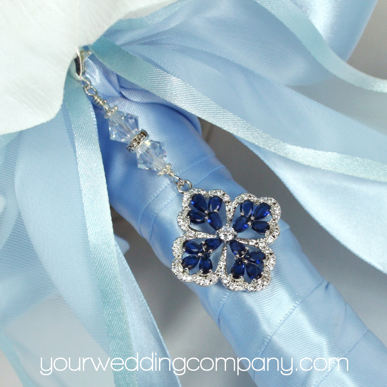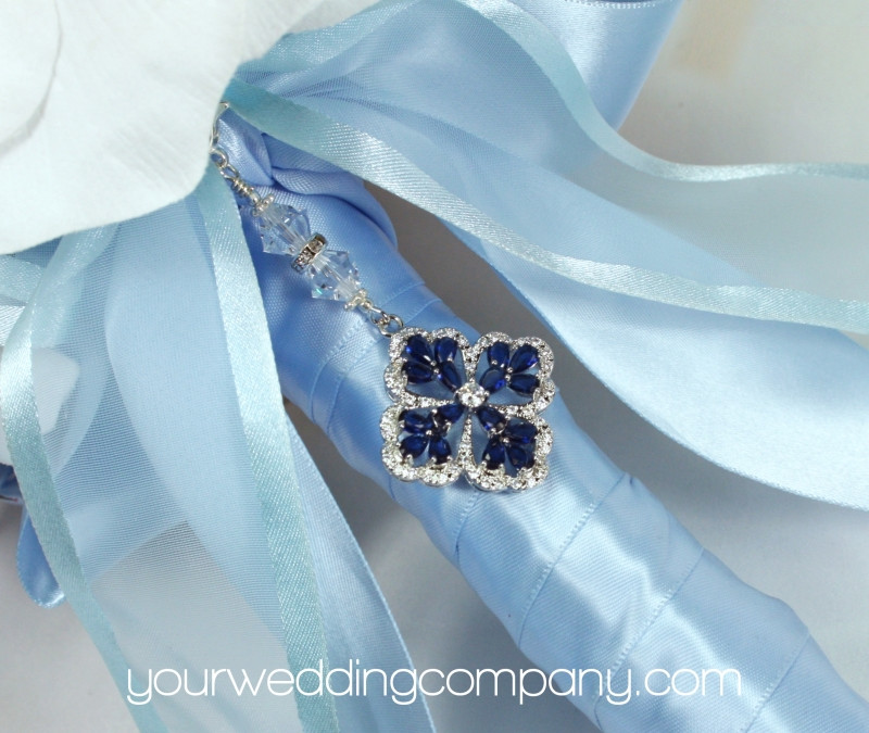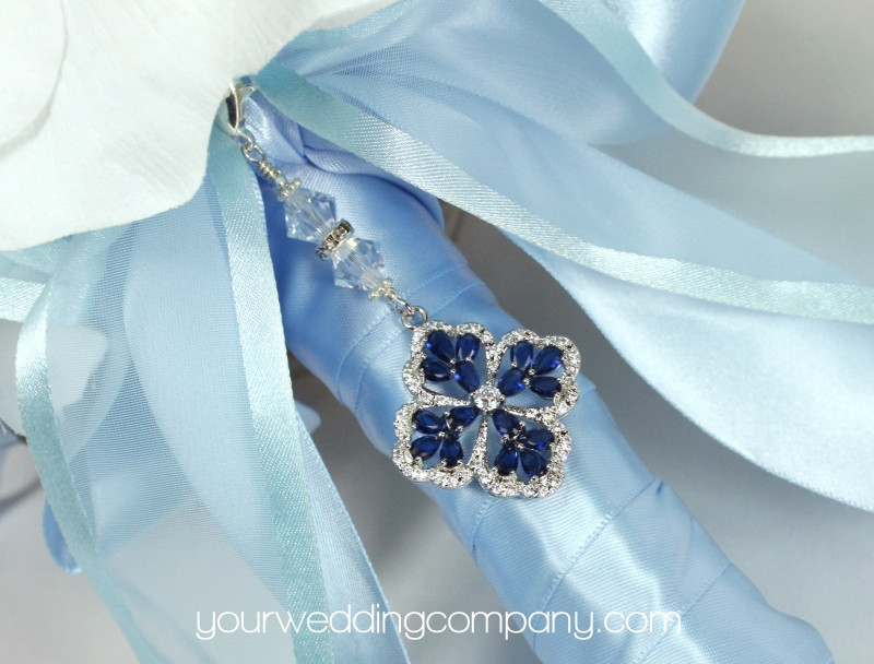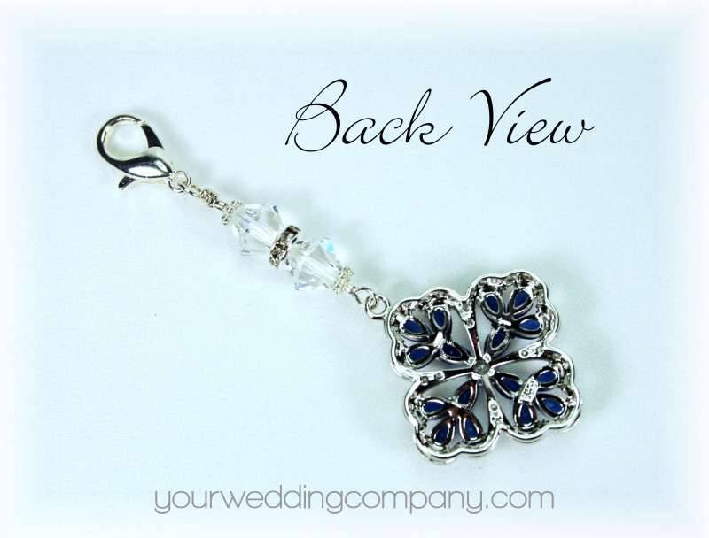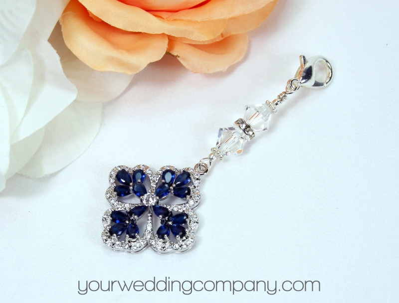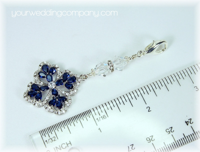 Something Blue Vintage-Style Crystal Bouquet Charm w/Swarovski Crystal and Silver Accents - This handmade keepsake charm is made with a pretty 1-1/8 inch clear Cubic Zirconia (CZ) charm with a blue sapphire CZ stones. It has a silver-plated lobster clasp and two clear Swarovski bicone crystal accent beads with a silver rondelle. The charm measures 2.8 inches long. You can easily attach it to your wedding bouquet with a ribbon or by directly attaching it to a flower stem.