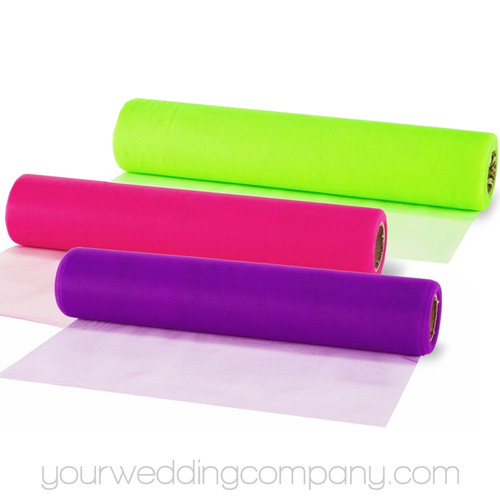This tulle width is perfect for tying around chair backs or using as table runners. Each roll is 24 inches wide by 25 yards (75ft) long.