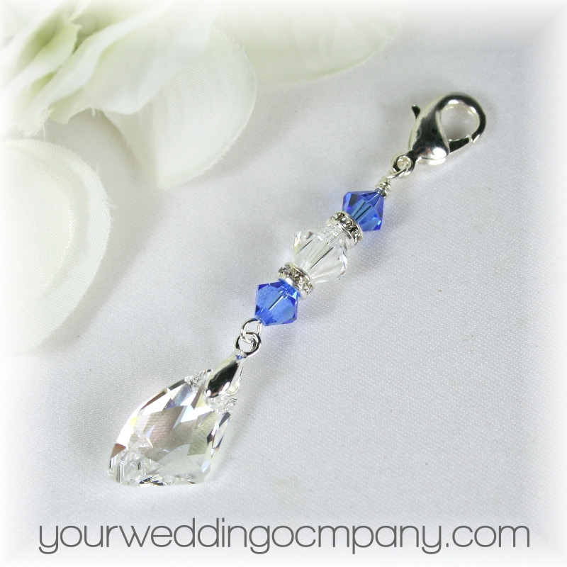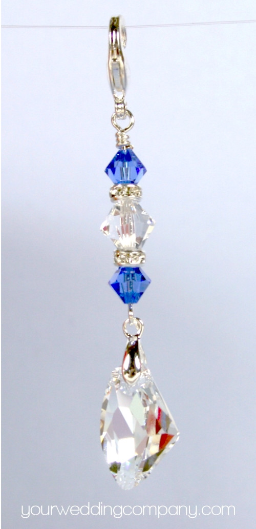 This handmade keepsake charm is made with a sparkling Swarovski crystal galactic-style pendant. It has a silver-plated lobster clasp, and Swarovski crystal accents in silver, clear and blue. The charm measures a total of 2-5/8 inches long. You can easily attach it to your wedding bouquet.